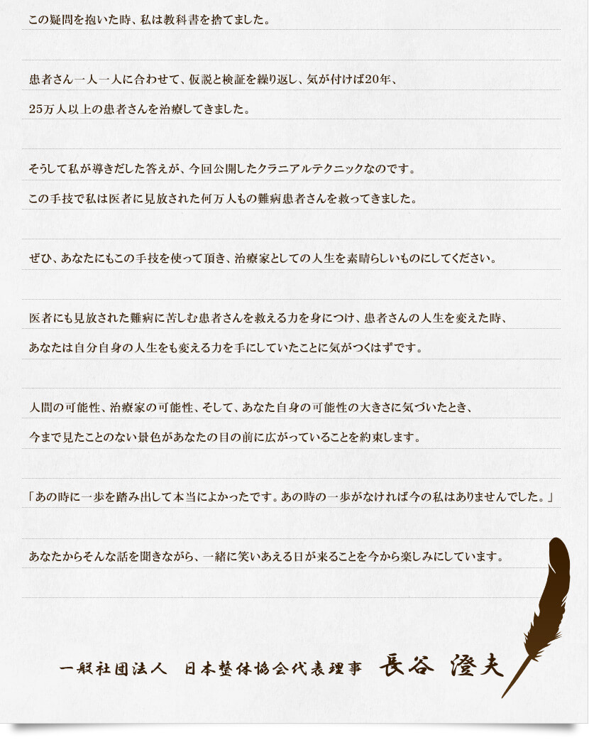 この、日本で唯一“量子力学”を取り入れた長谷先生のクラニアルテクニックを手に入れるチャンスは、これが最初で最後のチャンスです。